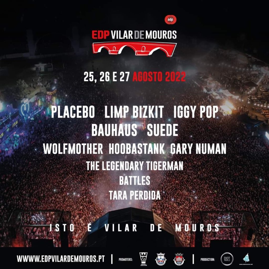 EDP Vilar de Mouros (Portugal) anuncia su regreso para los días 25, 26 y 27 de agosto de 2022, tras las cancelaciones de 2020 y 2021 por la causa de la pandemia. Uno de los mas longevos festivales de Europa anunció ese retorno con un sorprendente Line Up donde destacamos la presencia de Iggy Pop entre otros nombres internacionales como Wolfmother, Placebo, Limp Bizkit, Bauhaus, Suede, Wolfmother, Hoobastank…