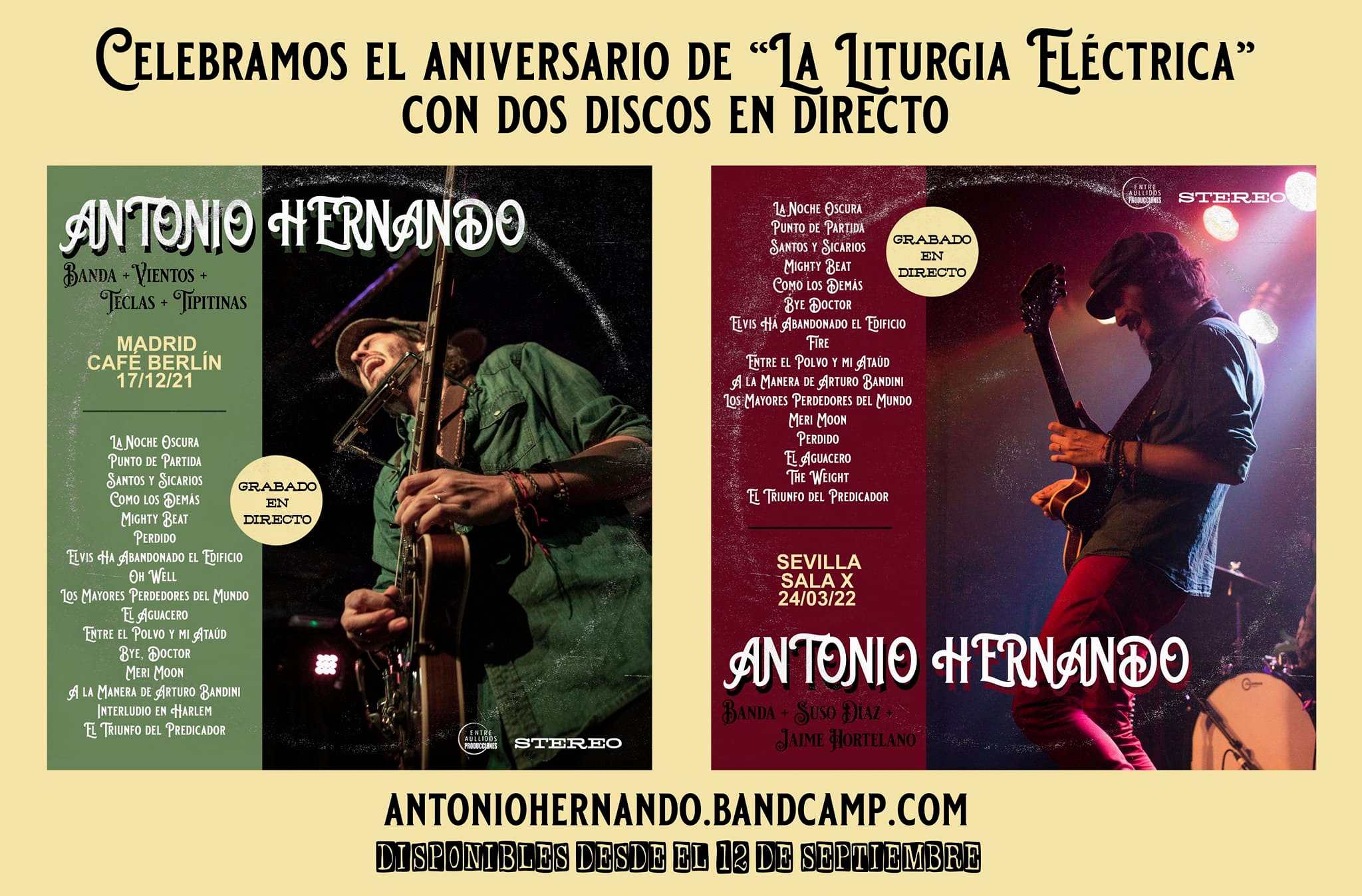 Del disco ya hablamos en su momento y si no lo hubieras escuchado o no hubieses extraído su jugo, ya sabes lo que puedes (deberías) hacer. Ahí están las diferentes plataformas (Bandcamp, Spotify, Apple Music o YouTube) y por supuesto los comercios del ramo. Pues bien, con motivo del aniversario de “La Liturgia Eléctrica” (esta vez entrecomillado y con mayúsculas), Antonio Hernando editará el próximo 12 de septiembre a través de su Bandcamp, y como agradecimiento a la buena acogida del disco, al trato recibido tanto por los medios como por parte del público, o a estos doce meses que han significado un resurgimiento y un esperanzador descubrimiento a todos los niveles (profesional y personal), dos grabaciones de la gira realizada correspondientes a Madrid (Café Berlín) y Sevilla (Sala X). Distintas y similares, parejas y personales. ¿Y por qué dos? Bueno, eso lo puntualiza el propio Antonio en el video que acompaña este artículo, amablemente nos envió y recomendamos escuches, porque en él comprobarás el grado de compromiso del tío con todo aquello que le rodea y llena su vida. Y en este caso no nos referimos exclusivamente al rock and roll, y como tampoco vamos a restarle un ápice de mérito a este documento, al César lo que es del César. Dale al play, y ve tachando los días en el calendario hasta el próximo lunes. Además, podemos adelantar que se aproxima una nueva gira que se extenderá hasta finales de año y arrancará en 14 de octubre.