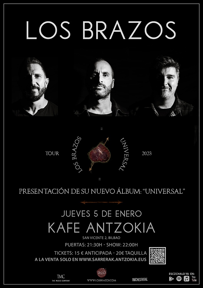 Noche de reyes, noche de regalos, noche de magos. Una noche universal, una velada con Los Brazos. Y podríamos entrecomillar universal, porque ese será unos de los presentes que los ídem podrán recibir en un Kafe Antzokia que esperamos registre una buena entrada porque la ocasión lo merece. Lleno hasta la bandera. Por otra parte, algo habitual en el historial particular entre William, Txemi y Kokino y una plaza tan significativa como el Antzokia, donde han presentado a lo largo de sus diez años de existencia alguno de sus trabajos o actuado bajo otras circunstancias. Además, si la memoria no nos falla será la segunda vez que ofrezcan un concierto en esta fecha, si bien la primera fue a orillas de la ría, en el Satélite T que por aquel entonces regentaba el ínclito Txarly Romero, obligada referencia cuando se habla de la escena bilbaína.