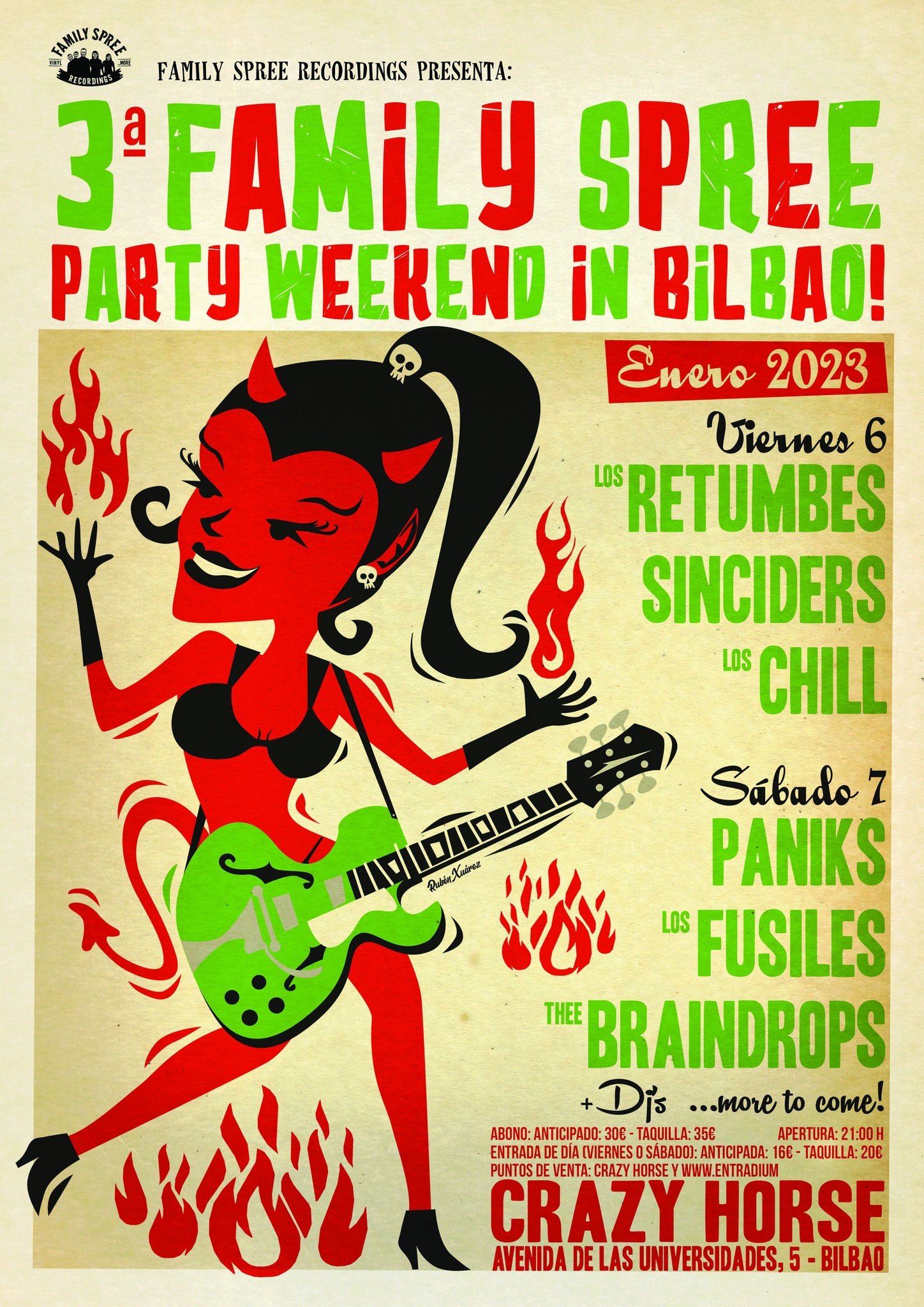 Después de la buena acogida de pasadas ediciones, el Crazy Horse bilbaíno abrirá sus puertas este fin de semana para acoger una nueva celebración del Family Spree Party Weekend. Concretamente, la tercera de un certamen familiar, un experimento festivo, una delirante iniciativa oficiada por formaciones adscritas a la escudería Family Spree Recordings, habituada a inspeccionar entre todo un maremágnum de estilos, géneros o pelajes habitualmente establecidos en la órbita del underground. Buena prueba de ello, el amplio inventario de artistas que han llegado a recopilar. En esta ocasión seis de ellos actuarán a orillas de la ría, en el local ya mencionado que aparte de organizar tinglaos de este calibre, refresca gargantas y sacia paladares. Bueno, en esta faceta organizativa deberíamos mencionar también a la agencia Undercover Producciones Booking, artífices de este y otros muchos montajes con el Rock n’ Roll como protagonista.