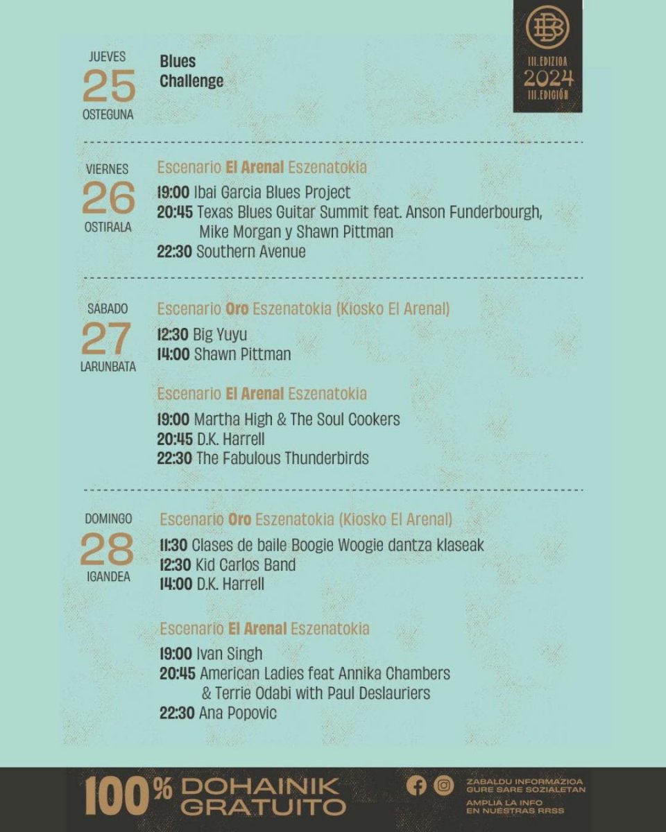 En lo que respecta a la programación de un festival respaldado por el Ayuntamiento de Bilbao, se intuye interesante en cuanto al nivel de artistas. El acceso continuará gozando de carácter libre en sus ya conocidos escenarios establecidos, el parque del Arenal donde se podrá disfrutar de las actuaciones vespertino-nocturnas y el cercano Kiosko del Arenal, dispuesto para los mediodías. También habrá actividades para todas las edades en diferentes puntos del botxo mientras en las inmediaciones del Itsasmuseum, imaginamos que podría ser bajo el puente de Euskalduna, se anuncia una jam sesión de bienvenida ofrecida por artistas que participarán en días posteriores y cuyos horarios ya están establecidos. Encargado de estrenar escenario y edición, el local Ibai García con su Blues Project que no nos cansaremos en aconsejar, porque son una gente tenaz que ha debutado recientemente con un competente disco que trasladan eficientemente al directo. Un comienzo que no deberías perder. Ahí lo dejamos. Como deberías atender las demás participaciones, cómo no.