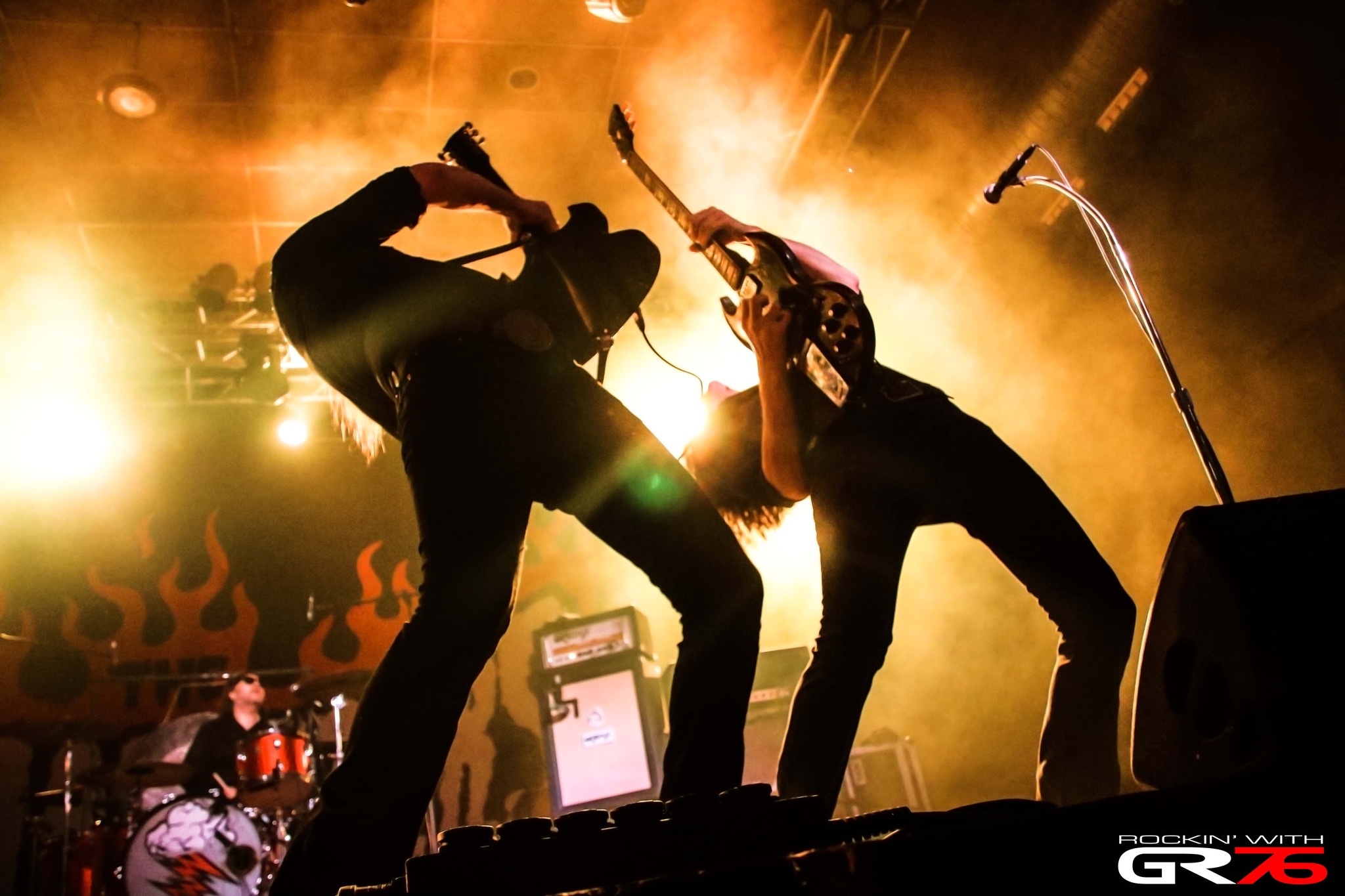 Entre la euforia del respetable, entre el ritmo frenético impuesto por los Copters, entre la pujante actividad y la maravillosa “Rainy Days Revisited” que nos transportó mentalmente en tiempo y espacio, estábamos disfrutando una barbaridad. De cuando en cuando, como en el caso de “You Are Nothin’”, nos recreábamos con el precioso Thunderbird que Dolph de Borst esgrimía con soltura y elegancia mientras, en la retaguardia, saltaban chispas en cada aporreo de Robert Eriksson en unos timbales y cimbales que deben pedir la baja por estrés después de tanta intensidad. Probablemente intensidad sea, junto a extenuación que habíamos apuntado al principio, otra buena síntesis o definición del recital de estos tíos que no conceden un segundo a la relajación. Unos tíos que imprimen velocidad en una multitudinaria “Eyes Of Oblivion” que, iniciada con el popular Gong del señor Eriksson, tantearía los pulmones del auditorio y obligaría a los guitarristas una vez más a efectuar el efecto espejo con sus respectivos mástiles. Unos tíos que te sugestionan con el glamour de “Everything’s On T.V.”, te enganchan con el espíritu libre y punkarra de “Soulseller” que inspecciona los cuellos del personal o se despiden por todo lo alto con “By The Grace Of God”. Pero la gente no se rinde. La gente pide más. ¿Queréis más…? No se hable más. Y lanzan un órdago con cuatro cartas ganadoras, con “Hopeless Case Of A Kid In Denial” que evidenciaría la extraordinaria competencia de viejas canciones que siguen mostrando la frescura de antaño, con la majestuosa conexión británica “I’m In The Band”, con uno de sus últimos pelotazos, “Reap A Hurricane”, y uno de sus primeros éxitos, “(Gotta Get Some Action) Now!” que acabaría, como usted puede imaginar, con oleadas de brazos en alto, con brincos y aullidos, con los chicos por los suelos y las huestes por las nubes, con alegría descontrolada y la sensación de haber vivido (o revivido) una enérgica experiencia con los Hellacopters. Apoteósico.