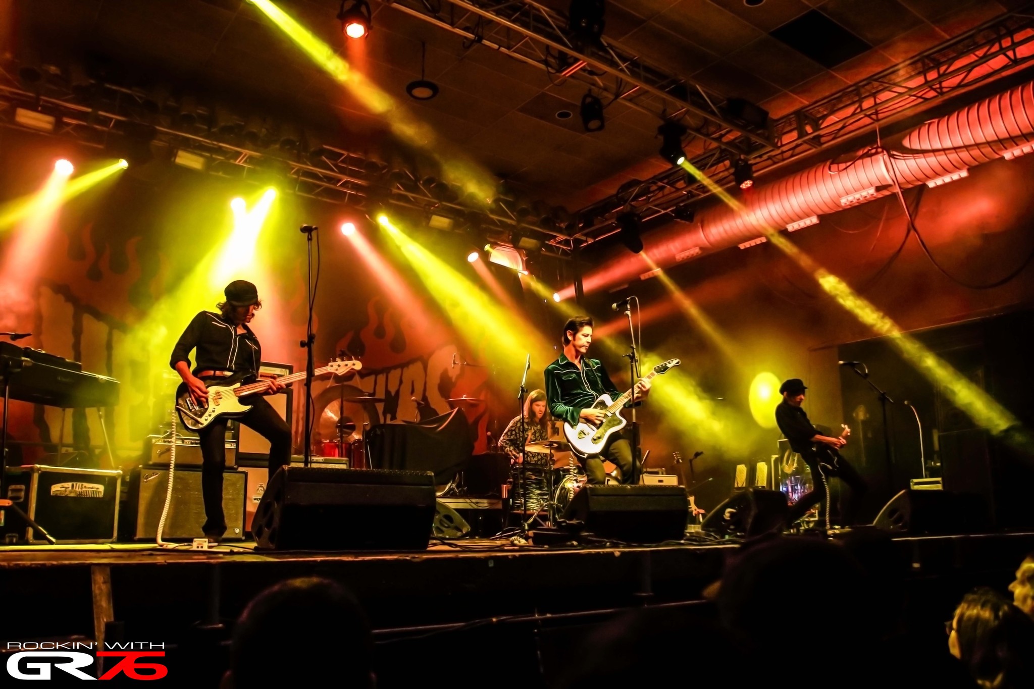 Desde los minutos previos a la apertura de puertas presentimos que iba a ser una noche especial, puesto que la hilera de gente acumulaba paulatinamente nuevas unidades y desde nuestra posición resultaba complicado ver el final cuando estábamos a punto de entrar. Una vez cruzado el umbral, la marabunta se iba posicionando y tras unos minutos de saludos, chácharas y nervios, arranca el show con los italianos The Peawees que concurren entre la humeante penumbra rojiza con “Road To Rock ‘n’ Roll”, perfecta toma de contacto que provoca histerismo y síncopes en unas primeras filas compuestas por bastantes fieles que se harían notar durante su intervención. Exigua, si nos ceñimos a los asombrados semblantes de varias de esas personas a quienes no negaremos razones para esa impresión, porque la actuación medió cual epé. Como un suspiro. Fructífero, grato y animado porque exprimieron el reloj con su optimista y comunicativo Rock ‘n’ Roll, pero al fin y al cabo un tanto limitado para una banda que demostraría garra y talante con canciones que transmiten buen rollo como “Christine” en la que Hervé Peroncini requería palmas. Con estallidos como “Wild About You” donde las guitarras del anterior y Dario Persi condensaban atenciones y palmas también; con exclamaciones como “By My Side” que sustituía palmas por ‘camones’ (come on) punkarras al unísono mientras Fabio Clemente retaba a la asistencia meneando el bajo a diestro y siniestro, o la pegadiza “Bleeding For You” que en apenas tres minutos recogía palmas, coros, actitud, guitarras, potenciales bailes en centímetros cuadrados y el ritmo atronador de Tommy González en platos y tambores. Culminarían con las reminiscencias setenteras de “Food For My Soul” que, evidentemente, transformaron el lugar en un viejo y colorista guateque donde nadie quería dejar de menear el bullate. ¿Se hizo corto? Sí. ¿Fue provechoso? También.