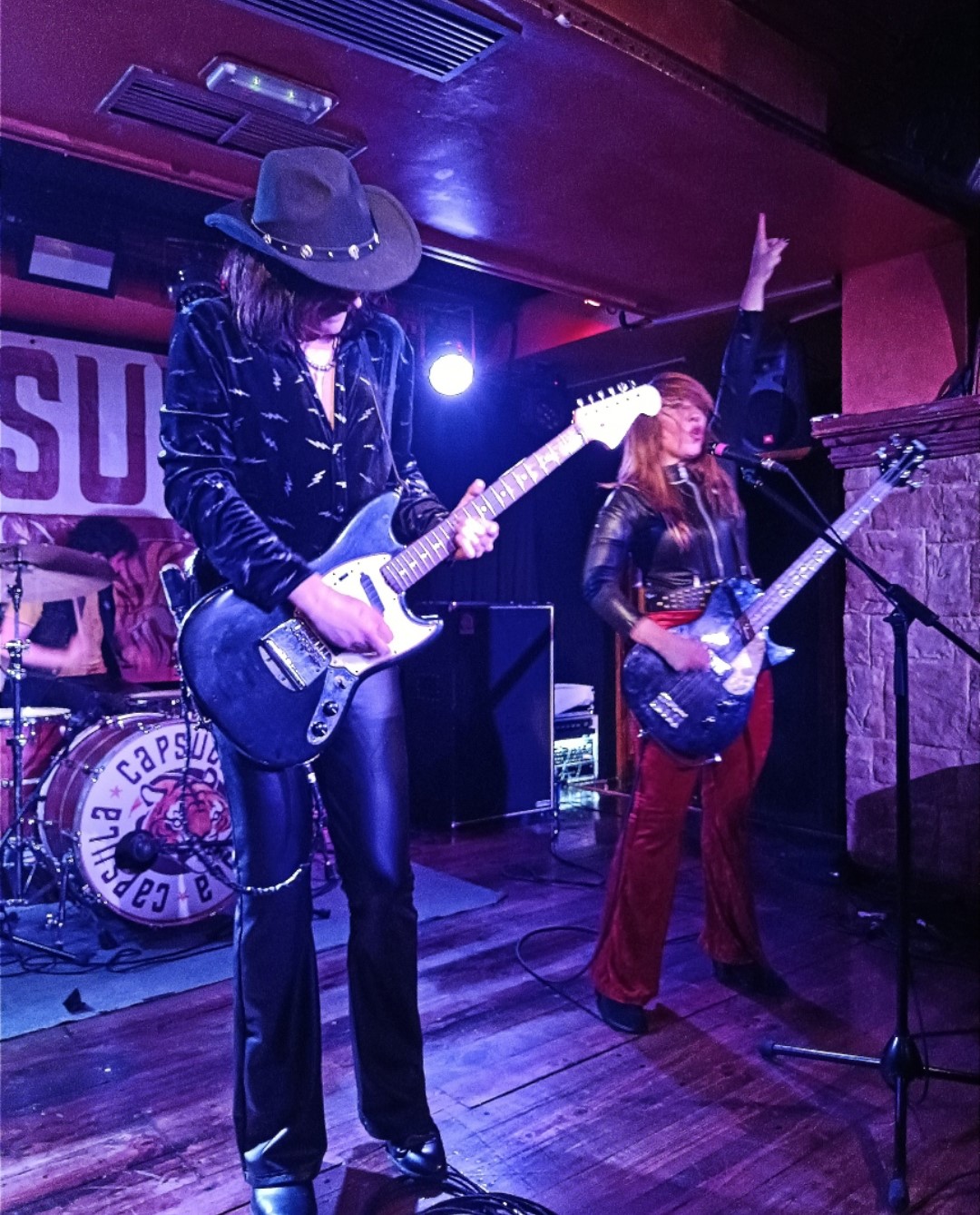 Otro momento muy destacado fue la poderosa “Go to the desert” otro de sus nuevos temas. Apenas tres minutos de vorágine rockandrollera donde Álvaro Olaetxea a la bataca se gustó de lo lindo, mostrándose rotundo, y con unos cambios de ritmo bestiales. Llega “In the garden of narcisus” palabras mayores, y ese riff machacón que se adueña de nuestras cabezas y no te suelta. Cabeceos, bailes, sudor, disfrute, los Cápsula estaban poniendo patas arriba Porta Caeli. Desempolvando en el escenario todas sus cualidades más preciadas, una actitud desbordante acompañada de una intensidad sin paliativos. De esas bandas de garito que te exprimen hasta el final, y su garaje rock y psicodelia chirriante hizo añicos cualquier pronóstico. Cerrando la noche con otras dos composiciones de su novedoso y brillante “Primitivo Astral”. “Arrow” medio tiempo que nos dio un poco de oxígeno ante tal avalancha. A las voces una vez más la genial Coni, que dejó una impronta bárbara toda la noche vocalmente y a las cuatro cuerdas, destacando además en su puesta en escena y espíritu. Para acabar con “Automatical soul” vaya atmósferas aquí, con banda y público llevando los coros mientras Martín tirando de wha wha mostraba una vez más la dinamita que llevan esas seis cuerdas. Estén atentos y cuadren agendas, presentan “Primitivo Astral” por toda la geografía, no se lo deben perder, toda una experiencia Cápsula en vivo.