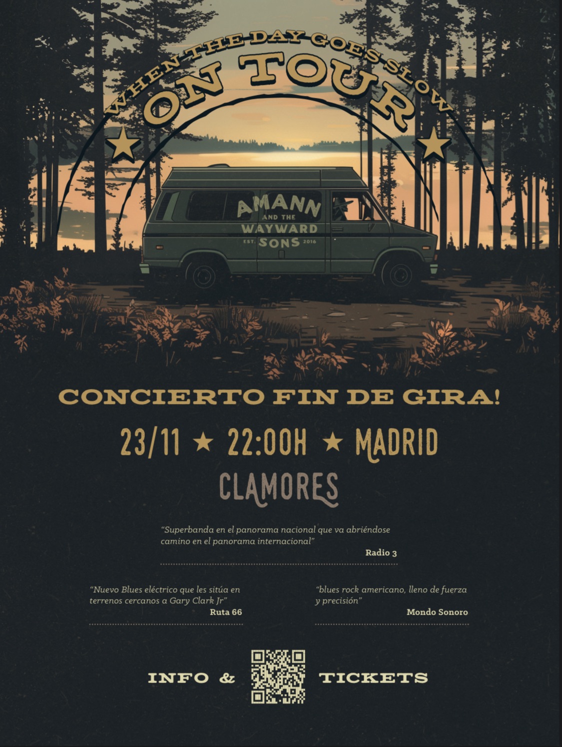 Posiblemente esté siendo un año inolvidable para los bilbaínos Amann & The Wayward Sons, o eufórico quizá. Desde que publicaron “When The Day Goes Slow”, su quinto disco allá por el mes de febrero e iniciaran la correspondiente gira en la localidad extremeña de Don Benito, han ido experimentado nuevas y gratas sensaciones. No obstante, esas gratas sensaciones afloraron antes de editar el álbum, puesto que recurrieron a una campaña de crowfunding que, evidentemente, se liquidaría positivamente tanto en el aspecto económico como en el anímico, ya que el apoyo recibido sería un gran aliciente para una banda independiente como ellos. Una banda firme y decidida que, a partir de entonces, se ha prodigado interviniendo en festivales o realizando conciertos propios transitando por mesetas, valles, aires y mares pues ha utilizado varios medios de transporte para llegar a las diferentes estaciones que marcaba su trayecto. La furgoneta, sin duda, habrá sido el vehículo de mayor rendimiento porque han recorrido un sinfín de kilómetros, pero en su cuaderno de bitácora tienen registrados un par de viajes en ferry que les han llevado hasta África o Inglaterra, lo cual es una circunstancia a destacar.