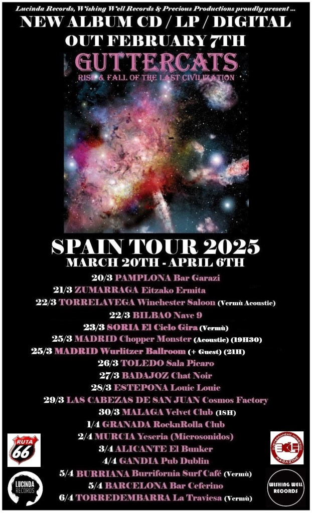Obstinados, incansables, tenaces, fiables, audaces y amenos. Así son los galos Guttercats, quienes cruzarán de nuevo los Pirineos sobre la segunda semana de marzo y rondarán los alrededores entrado abril. O sea, algo más de dos semanas en las que tienen previsto ofrecer diecinueve funciones eléctricas unas y acústicas otras, puesto que uno de los grandes alicientes de su itinerario es la flexibilidad de horarios y formatos además de la presentación de un nuevo álbum, “Rise & Fall Of The Last Civilization” que pondrán en circulación el 7 de febrero. Involucradas en la edición del que será su sexto trabajo al que habría que sumar unos cuantos epés y algunos recopilatorios, están las compañías Lucinda Records y Wishing Well Records, madrileña y francesa respectivamente.