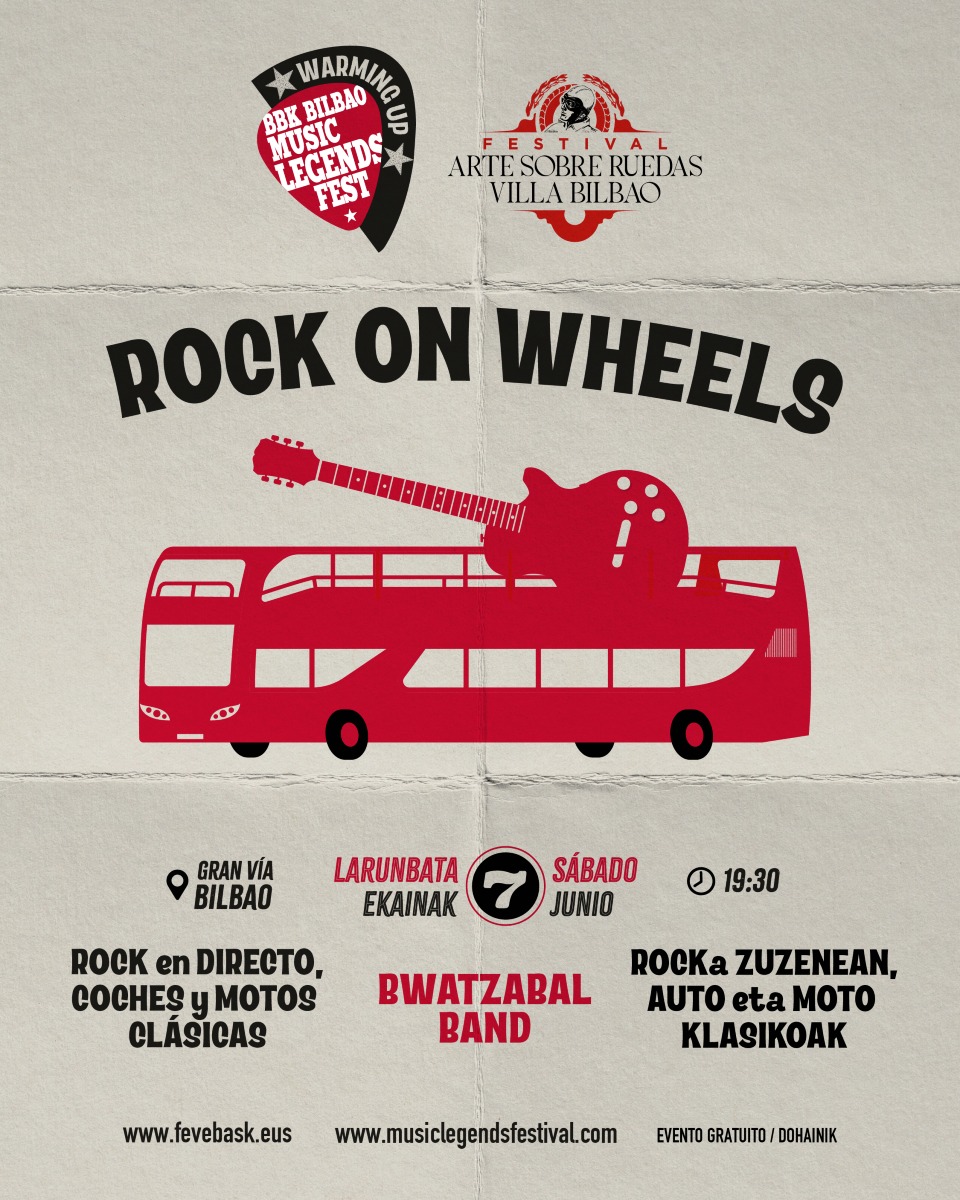 El BBK Bilbao Music Legends Fest celebrará el sábado 7 de junio su tradicional Warming Up, una acción previa al festival principal que este año se integra en la programación del Festival Internacional Arte Sobre Ruedas, evento que se desarrollará del 6 al 8 de junio en Bilbao. El Warming Up de este año consistirá en un espectáculo itinerante a bordo de un autobús turístico de dos plantas de Bilbobus, en cuya parte superior descubierta la banda local Bwatzabal Band animará las calles con música en directo, interpretando grandes himnos del rock mientras recorre el centro de la ciudad. Será la primera vez que una banda de música actúe en vivo mientras circula en autobús por Bilbao, marcando un hito singular en la agenda cultural de la villa. El autobús de dos plantas estará presente durante todo el día, y a las 19:30 horas partirá desde el Teatro Arriaga acompañando el gran desfile de vehículos de dos y cuatro ruedas hasta la Plaza Sagrado Corazón, recorriendo así la Gran Vía tras haber pasado por la Plaza Circular y Moyúa.