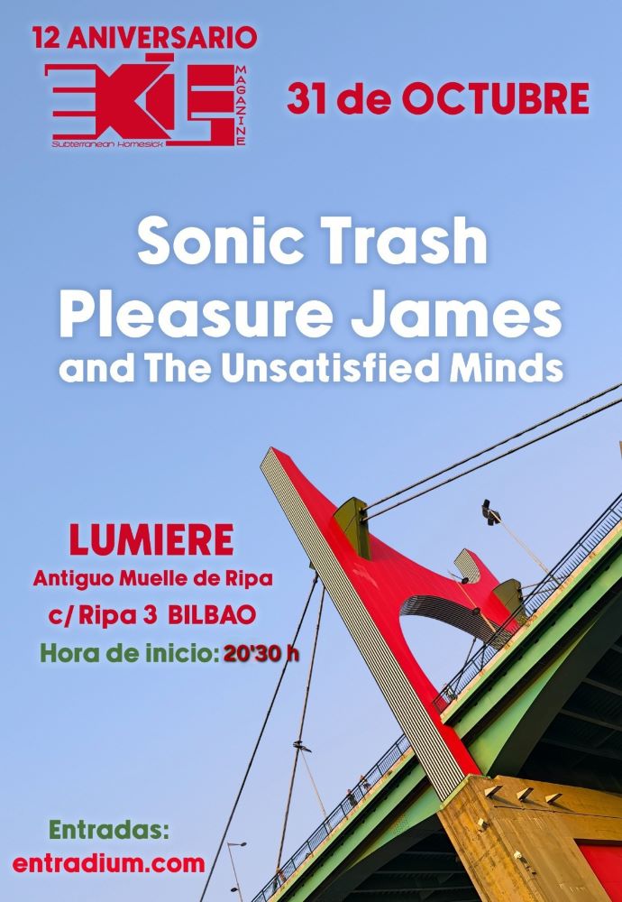 El próximo viernes 31 de octubre es la fecha elegida por los responsables del Exile para celebrar, a orillas de la ría y a partir de las 20:30, su onomástica junto a gente afín y dos bandas de pedigrí: Sonic Trash y Pleasure James & The Unsatisfied Minds. Dos conjuntos sobradamente conocidos, dos magníficos valedores del del underground bilbaíno y dos bandas con el gancho suficiente como para llenar la sala Lumiere, el antiguo Muelle de Ripa donde anfitriones y cicerones conmemorarán doce años de travesía y más de 5.000 publicaciones narrando chismes, anécdotas y peripecias sobre el rock and roll, sus figuras o sus esperanzas por parte del magazine. Además, parte del staff del sitio puntocom propone, una vez finalizadas ambas actuaciones, una animada sesión rocanrolera de DJ’s. Es decir, más leña al fuego, más diversión. Más alicientes y suficientes razones para asistir ya que la cifra tiene su aquel y probablemente la gala sea memorable, porque…