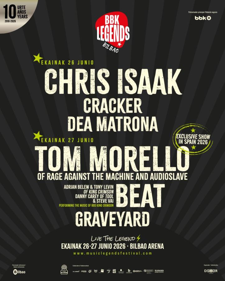 A falta de conocer quiénes integrarán el habitual e ilusionante bloque local, la organización del festival bilbaíno adelantó en diciembre, aparte del nuevo logotipo y nueva denominación, los nombres de bandas y artistas que actuarán en el escenario principal. Es decir, Chris Isaak, Tom Morello, Beat, Cracker, Graveyard y Dea Matrona. Salvo las norirlandesas que comenzaron en 2019, gente sobradamente experimentada y con una pródiga trayectoria tras de sí. Fructífera, exitosa y legendaria, que es una de las principales razones de la existencia del ciclo anual Music Legends que reúne en la céntrica Sala BBK de la Gran Vía bilbaína a un grupo de artistas de dispares conductas, siendo el germen de un festival que acometerá su novena edición en diez años de existencia y dos etapas divididas en sus ubicaciones y separadas entre sí por el veinte veinte de infausto recuerdo.