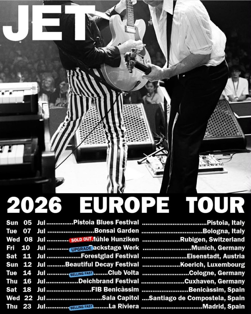 JET, la banda australiana liderada por los hermanos Nic Cester (voz y guitarra) y Chris Cester (batería), junto a Mark Wilson (bajo) y Cameron Muncey (guitarra), estarán este 2026 inmersos en una gira internacional que los traerá a Europa y entre sus paradas estarán: Benicássim (FIB Festival), Santiago de Compostela (UNDER FEST) y Madrid.