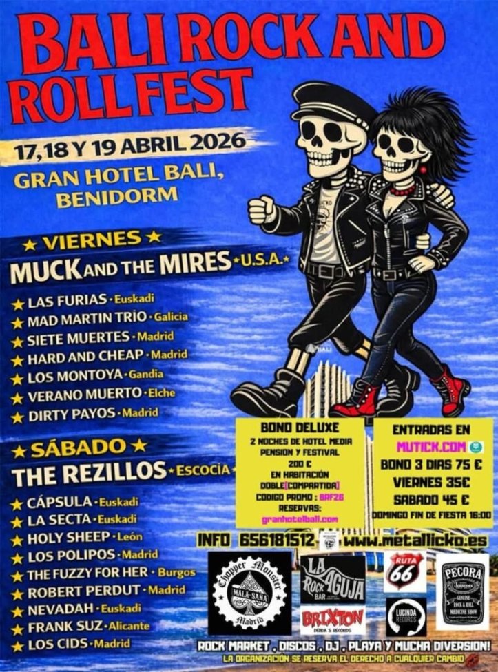 Si hace escasos días dábamos cuenta de un festival alicantino, en esta ocasión nos centraremos en otro preparado en la misma comarca el fin de semana anterior: el Bali Rock and Roll Festival. De diferente ambiente, pero al fin y al cabo dirigido a público amante del rock and roll. Entre los días 17 y 18 de abril (viernes y sábado), el Gran Hotel Bali de Benidorm (el más alto de Europa) acogerá una nueva edición de un certamen que, forjado por la tienda especializada Metallicko Leather, se está convirtiendo de alguna manera en referencia para gente afín al underground, al garage, a los sonidos beat, al punk, al surf, el rockabilly, la psicodelia, el glam y tantas otras variantes del sempiterno rock and roll. Recordamos que el equipo organizador es una reconocida firma dedicada a la venta de prendas de piel que, además, se encuentra celebrando su trigésimo noveno aniversario.