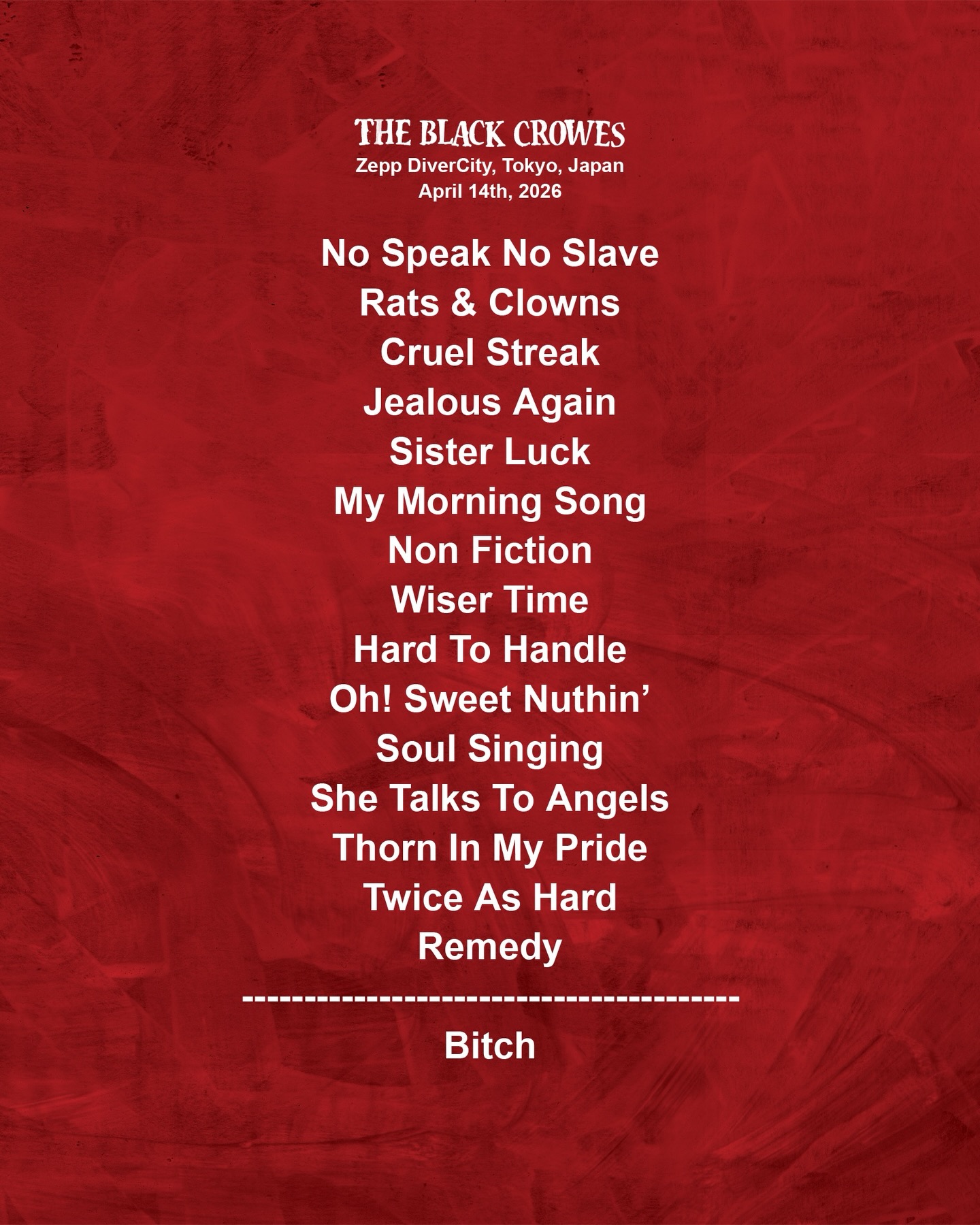 The Black Crowes actuaron en Japón tras su paso por Australia. En su paso por la capital nipona (donde no volvían desde 2022), únicamente interpretaron en directo una canción de su nuevo álbum, «A Pound Of Feathers«, concretamente «Cruel Streak«. El setlist estaba cargado de grandes éxitos como: «Jealous Again», «Wiser Time», «She Talks to Angels» y «Remedy», además de versiones clásicas como «Hard To Handle» de Otis Redding, y «Oh, Sweet Nuthin'» de The Velvet Underground.