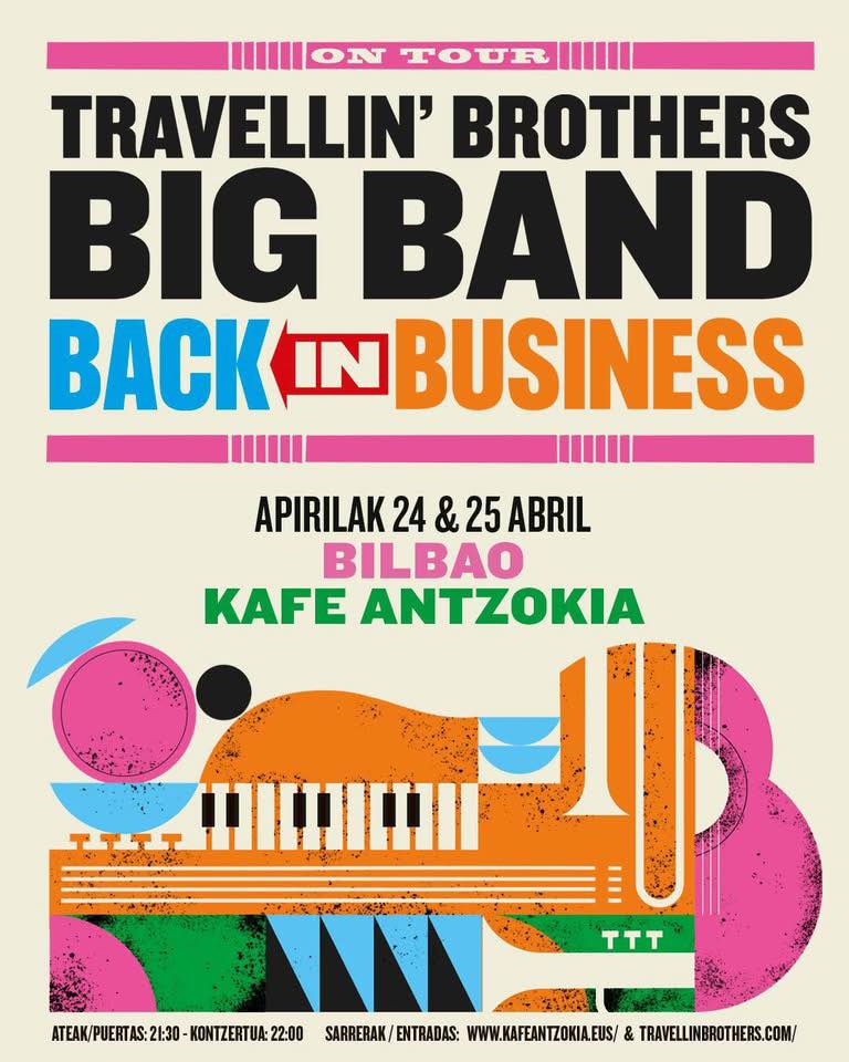Con casi dos décadas a sus espaldas, los hermanos Eneko y Aitor Cañibano, su primo Jon Kareaga, Alain Sancho, Mikel Azpiroz e Isi Redondo amén de las corales aportaciones de Inés Goñi, Noa Eguiguren o antiguos compañeros como Ander Unzaga, han viajado ininterrumpidamente por el planeta dejando bien alto el pabellón, su sello y su independiente identidad. Ante todo, son independientes y han debido mantener viva esa condición, a pesar de haber conseguido logros que para sí querrían bandas de mayor renombre, contra viento y marea. Los más de 1.200 conciertos ofrecidos, así como los diez álbumes editados durante este camino en ocasiones recto, tortuoso y curvo en otras, con pronunciadas pendientes, bajadas peligrosas o relajantes senderos junto al mar, son su gran aval. Pues a ambas cifras añaden “Back In Business”, un número más en el caso álbumes, y otro par a los conciertos ofrecidos, ya que hoy viernes 24 y mañana sábado 25 de abril, Kafe Antzokia recibirá con los brazos abiertos a Travellin’ Brothers, a la Big Band y a una marabunta de gente hambrienta de fervor, magia e ilusión. Entradas disponibles en la página web de Kafe Antzokia.